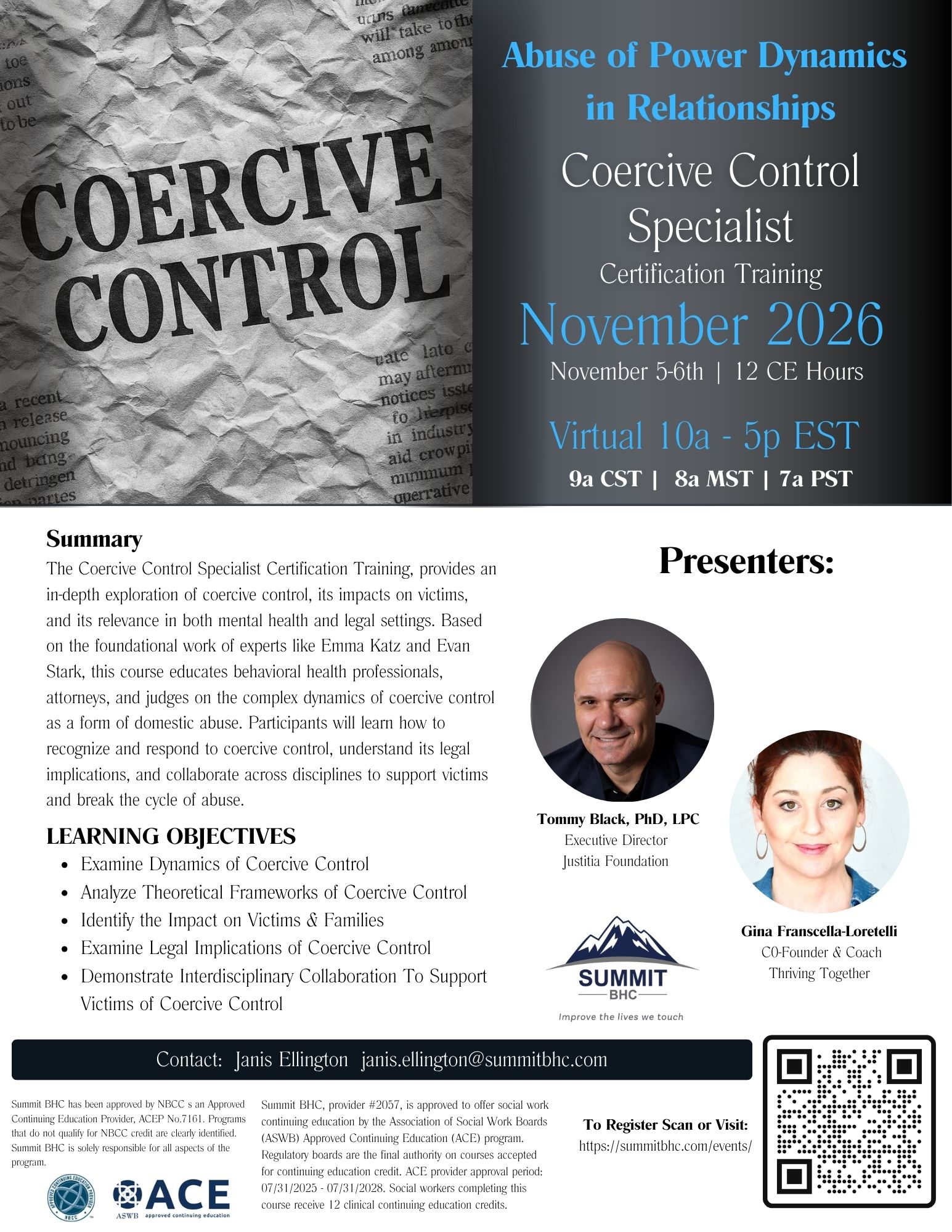 For questions regarding Summit BHC sponsored events, please reach out to Janis Ellington, Director of Education & Event Strategies, at 912-678-4480 or janis.ellington@summitbhc.com.
